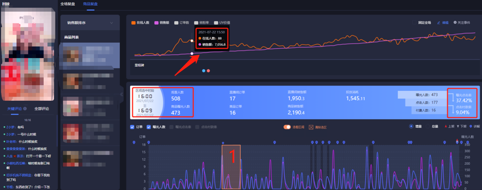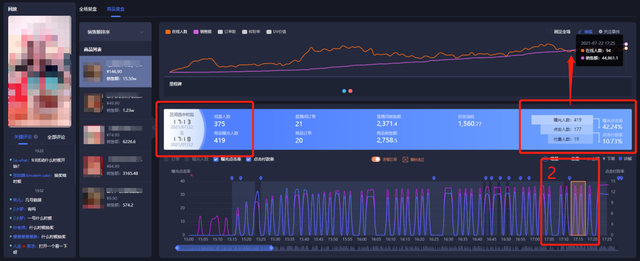 通過【商品分時段復盤】功能,可以發現該直播間在講解時段1和時段2內,講解的都是同一款產品,但是時段2的效果明顯好于時段1,說明時間段2中主播的話術和節奏承接流量的能力更強。