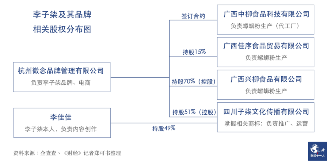 去年8月,在柳州與李子柒品牌合作發布會上,李子柒宣布,將在柳州投資建造線下工廠。企查查數據顯示,去年7月底,廣西興柳食品有限公司成立,由微念全資持股;今年3月,杭州創柳食品有限公司入股興柳,持股30%,微念持股70%。今年4月,微念又入股廣西佳序食品貿易有限公司,持股15%。公開資料顯示,興柳、佳序皆從事螺螄粉生產。