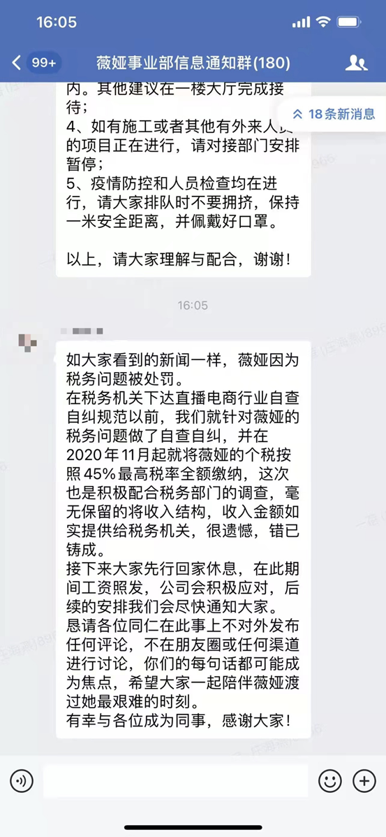 一張流出的薇婭事業部內部群聊天記錄顯示,事發后,公司已經第一時間通知讓全體員工回家休息,工資照發,后續安排等待公司通知。
