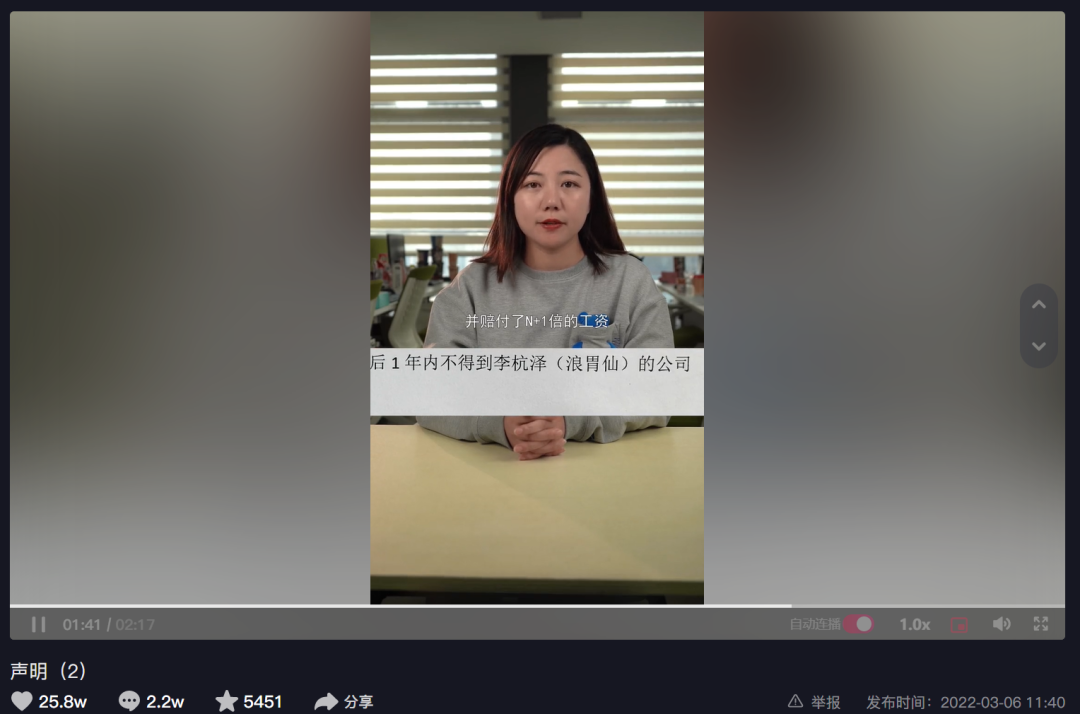 賬號(hào)歸屬權(quán)之外,此次游絮和“浪胃仙”的另一個(gè)爭(zhēng)議,是出走團(tuán)隊(duì)的競(jìng)業(yè)限制問題。在游絮看來,她已經(jīng)支付了“n+1”的賠償,且對(duì)員工的解約條款中明確做了競(jìng)業(yè)限制,爾后卻在“浪胃仙”的視頻里看到了他們的身影。而“浪胃仙”則認(rèn)為她無權(quán)對(duì)開除的員工做競(jìng)業(yè)限制。