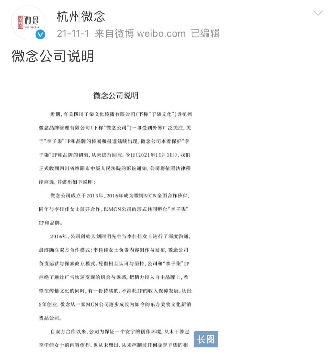 “資本的好手段”后,李子柒選擇停更以示抗議,并和其背后的微念對(duì)簿公堂。從去年7月至今,李子柒仍未更新視頻,官司也未有進(jìn)一步的結(jié)果。這不僅對(duì)李子柒本人的商業(yè)價(jià)值有傷害,更對(duì)靠“李子柒”吃飯的杭州微念造成巨大影響。