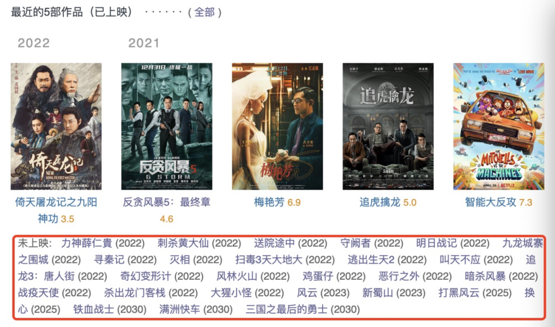 直到李仁港積壓5年的《青面修羅》突然上了網絡院線,硬糖君才驚覺有兩年沒看到這位香港導演的電影了。上一部還是2019年的《攀登者》。除了他以外,以前春節檔的“常客”、拍《西游記》系列的鄭保瑞,也很久沒在內地上片了。要知道,香港導演可是出了名的“活兒快”。隔了這么久沒作品上映,莫非都被積壓了?硬糖君馬上梳理了一下待映庫存,果不其然。香港導演還真是積壓大戶。拍完未上映的香港導演影片中,光是演員陣容有賣相的,就至少50部。像邱禮濤這種勞模導演,手上竟然壓了有5部片之多;2016年《特工爺爺》后沒再上片的洪金寶,近年來因身體不佳處于半隱退狀態,手上也壓了4部片沒上;連執導《反貪風暴》系列正當紅的導演林德祿,手上也有4部片沒上。而作為香港導演最愛用的勞模演員,古天樂更是受積壓片連累的冤大頭。今年上半年,我們只看到他有一部王晶執導的網大《倚天屠龍記》。而實際上,古天樂積壓的庫存作品多達27部。除開沒有流出劇照、疑似流拍的電影,也有15部之多,包含邱禮濤執導的《掃毒3》《暗殺風暴》《戰役天使》、特效轉行的新導演吳炫輝的《明日戰記》《尋秦記》等。事有蹊蹺。須知疫情之后影院鬧片荒很久了,可看香港導演人均手上有存貨,積壓了這么久為什么不趁機“清庫存”?王家衛一直被稱為香港電影體系里生長出來的“異類”,患有嚴重的創作拖延癥,也可以說是“精益求精”的作者導演的通病。王家衛拍《2046》,花了五年。拍《一代宗師》,從籌備算起,拖了十年。而上述積壓片里,有一部分片子遲遲未上映的原因,就是導演陷入了“王家衛怪圈”。周星馳來內地拍片后就患上了拖延癥,《美人魚2》是拖最久的。電影已經殺青將近4年了,2019年一度傳聞說要上春節檔。現在都2022年了,卻沒有一點上映的消息。去年3月,周星馳現身深圳補拍,粉絲都以為看到上映的曙光了。結果7月,傳聞戲份很多的男二號吳亦凡,出事了。雖然這事不能全怪周星馳拖延,誰能料到攤上劣跡藝人耽誤事。但一個項目時間拖越久,就越容易遇上不可控風險,因為政治輿論環境一直在變化,指不定哪天又爆了一個雷。唯一可慶幸的是,這部電影的資方是聯瑞,算是疫情這兩年異軍突起的電影公司,靠著“哭片”《我的姐姐》《送你一朵小紅花》大賺,家底大概還夠支撐星爺找補后期。關于王家衛的《繁花》(電視劇),之前硬糖君就提到過,2020年爆出開機消息后,殺青的時間一直撲朔迷離。今年1月傳出殺青,但又有消息稱還要補拍,電影一直沒官宣殺青?,F在,男主演胡歌已經進組正午陽光新劇《縣委大院》。粉絲都以為這算官宣《繁花》拍完了。但按照王家衛的性格,等胡歌拍完劇再補拍也不是不可能。畢竟當年木村拓哉拍《2046》5年間不斷返場補拍,中間還回日本拍戲、結婚生娃。王家衛雖慢,但他也不耽誤演員別的活兒。香港大導演現在手上有存貨的,還有爾冬升。2016年拍完《三少爺的劍》,又過了5年爾冬升再執導筒的主旋律作品《海的盡頭是草原》應該不會積壓很久,有望年內上映。除開大導演外,六年前被看好的兩位新銳導演翁子光、麥浚龍,也是嚴重的拖延癥患者。原本這倆因為《踏血尋梅》《僵尸》在金像獎大放異彩,讓青黃不接的香港影壇看到了“后繼有人”的希望。但沒想到,倆人新作《風再起時》《風林火山》一拖再拖,還沒上映的消息,被影迷戲稱為“風氏雙鴿”。兩部電影都是2017年開機,都是投資成本超過2億的“昂貴”港片,殺青也有四五年了,卻一直停在漫長的后期中。除了拖延癥導演外,那些“活兒快”的香港導演片子被積壓的一個很大原因,可能在于類型的高度雷同,幾乎都是動作、犯罪、懸疑、災難。前文提到的至少50部有賣相的積壓片中,有超30部是這一類型,占了三分之二。單是“積壓大戶”邱禮濤、林德祿,手上就分別有5部、4部同類型影片。而且他倆還是疫情后票房最能打的香港導演,邱禮濤《拆彈專家2》賣了13億,林德祿《反貪風暴5》賣了6億。按理說,資方應該對他倆片子有一定信心。如果他倆都沒排上號,更不用說其他導演的同類型片子了。而且這些同類型積壓片,還幾乎都是類似的演員配置——反正就是香港幾大勞模演員古天樂、郭富城、劉青云、林家棟的排列組合,讓影片幾乎打不出什么差異化的賣點。這就可以理解為什么它們會被積壓了,因為片方要認真考慮錯開檔期的問題。既要錯開同類型影片,還要錯開勞模演員的其他影片。再加上疫情反復的原因,片方考慮到全國影院營業率、上座率一直波動,態度變得愈加謹慎。這樣一來,可選擇的、穩定的檔期本來就不多,如果都瞄準了重要檔期去,很可能被同類型影片搶先定檔,從而不得不選擇再度延期,觀望下一個檔期。比如邱禮濤的《暗殺風暴》2018年殺青,原本定檔去年12月,因同類型強勁對手《誤殺2》空降而選擇撤檔;今年該片一度傳聞定清明檔,又因跟《神探大戰》撞型而撤了。后來因為疫情,整個清明檔都撤了。而《神探大戰》和《暗殺風暴》還要在往后的檔期里,為錯開彼此而斟酌檔期。但無論如何避讓,超30部香港導演的同類型影片,大概率會在未來的檔期狹路相逢。如果繼續觀望繼續撤檔,積壓的時間就會更長,又要擔著制作水平比同類型新片差的風險。除了同質化嚴重、難尋檔期外,還有一部分影片積壓,純屬是被不靠譜的資方坑