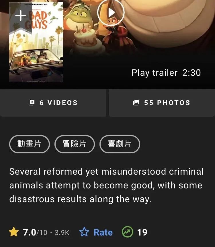 導演建立了一個人類和動物共生的世界。人類對“壞蛋們”與生俱來的恐懼使得他們固化了自我的認知,從未設想過自己的生活還有另一種可能——做個好人。這種意識的沖擊、認識的轉變也造就了本片的喜劇效果,也塑造了壞蛋們可愛、天真的形象。