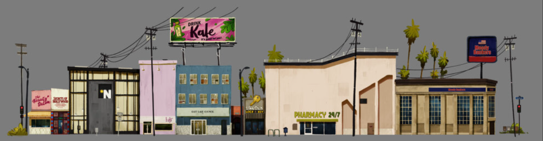 這部電影里展現了洛杉磯地區的 10 幾個地標建筑作為設計參考,包括延伸到洛杉磯河上的第六街高架橋、洛杉磯市中心、中城、奇跡一英里、回聲公園/銀湖、帕薩迪納/高地公園、極樂公園、馬里布、圣莫尼卡、查茨沃斯和世紀城。