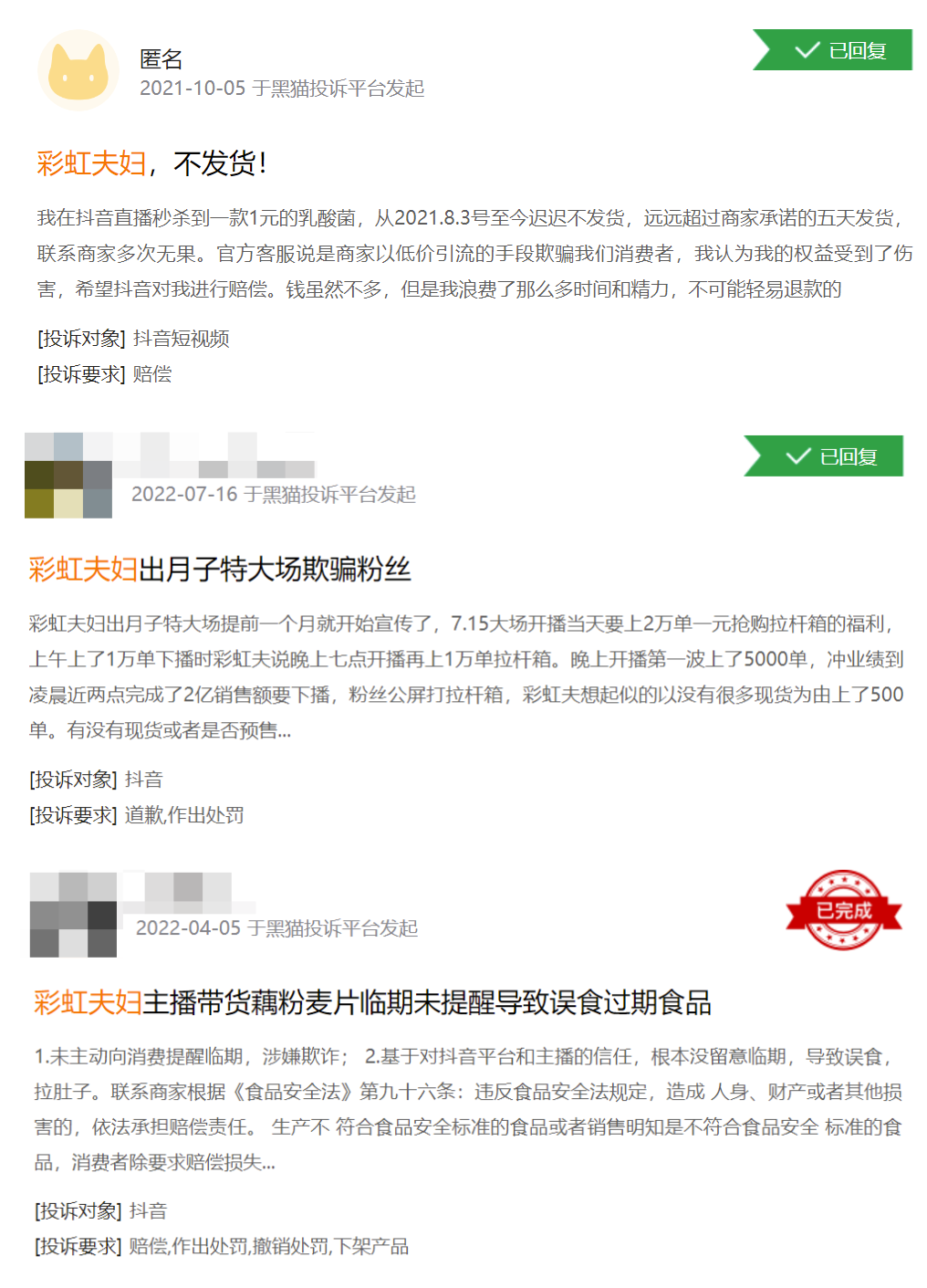 在黑貓投訴平臺,彩虹夫婦的相關投訴有20條,集中在虛假宣傳、拒不發貨、欺騙消費者等,顯然已經引發了粉絲的信任危機。而投訴中提到了一條與7月15日直播有關的內容。大意是承諾在下播前發放福利,用1塊錢秒殺5000個拉桿箱,結果消費者只秒了500個,孫彩虹就匆匆下播了。當時直播間還有3萬多粉絲,白白蹲守到凌晨。