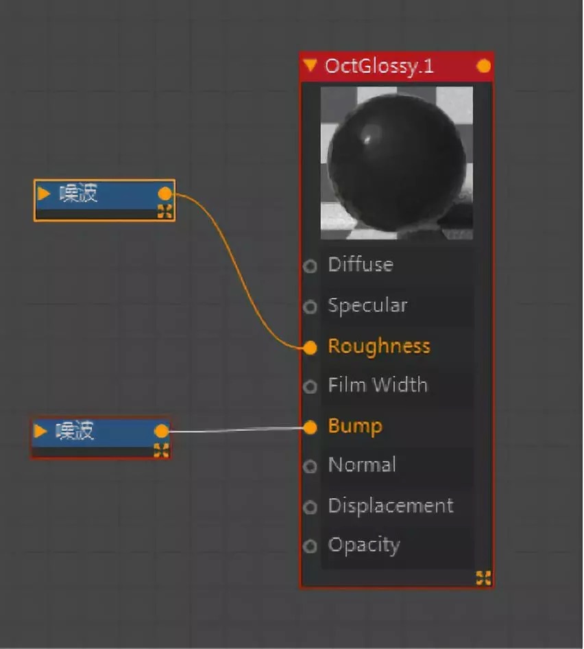 創建一個反射材質球,顏色調為一個深色,給圓柱,再復制一個給地面。然后進入材質球的節點編輯器中,添加noise調節噪波大小種類對比度,貼在roughness(粗糙度),這一步目的是產生反射的變化形成水漬的效果。復制noise降低對比度貼在bump上,目的是讓水洼有一點深度,和凹凸細節。