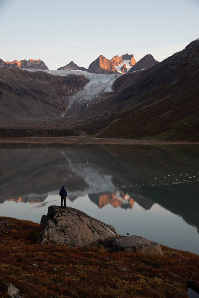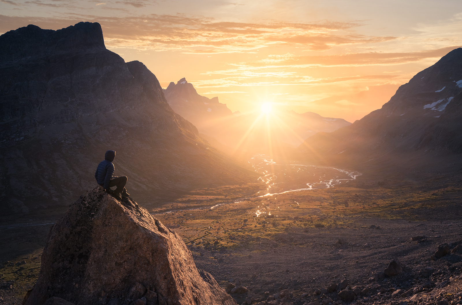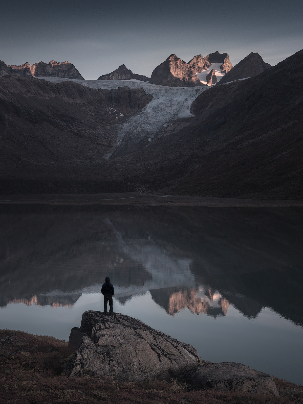 上面這張照片也是拍攝于格陵蘭島,同樣是一個人站(坐)在石頭上。