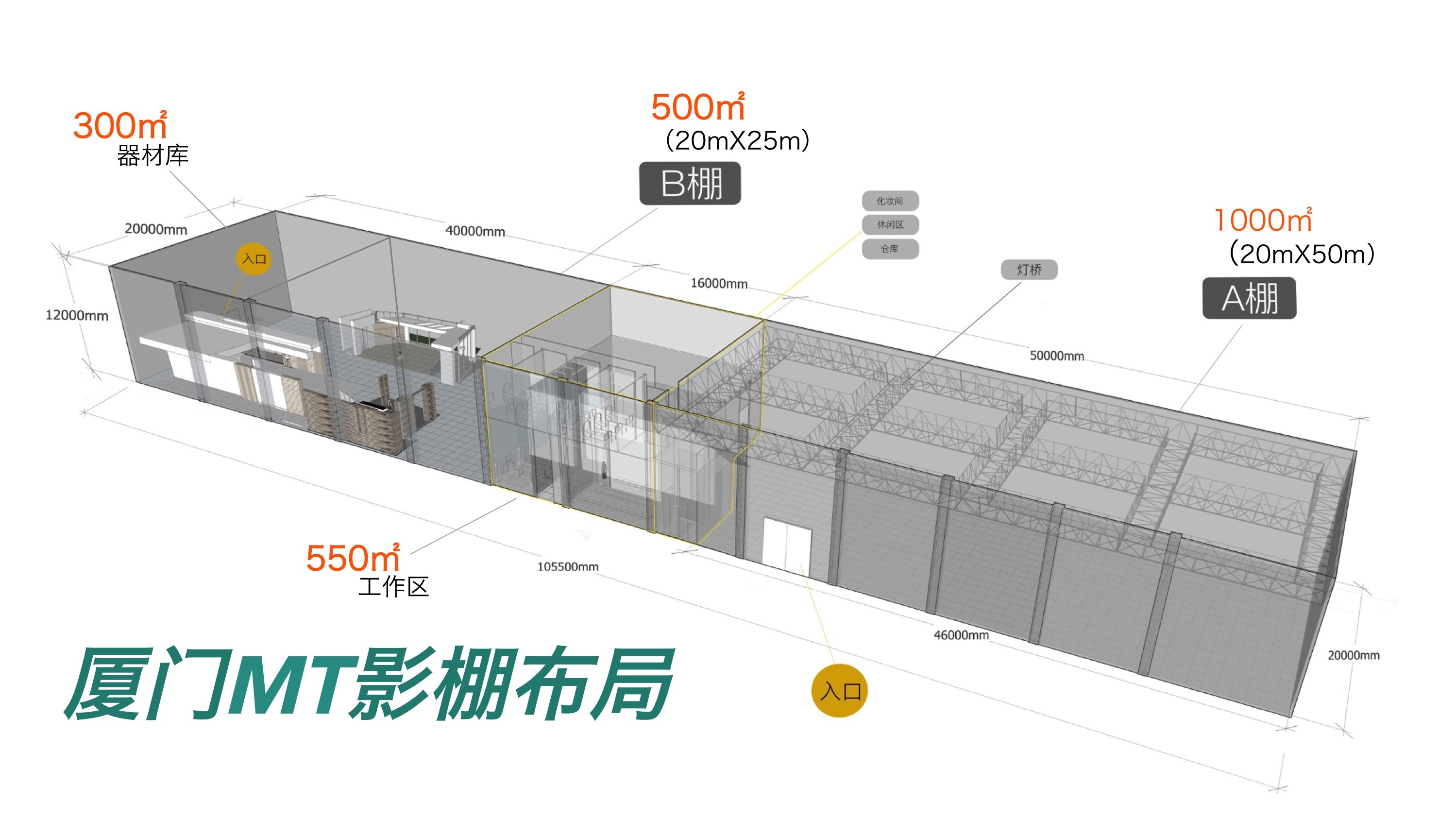 廈門MT是一家致力于為影視拍攝提供全套服務的公共片場,兩個影棚分別為1000平米和500平米,配套工作區(qū)550平米和器材倉庫300平米。