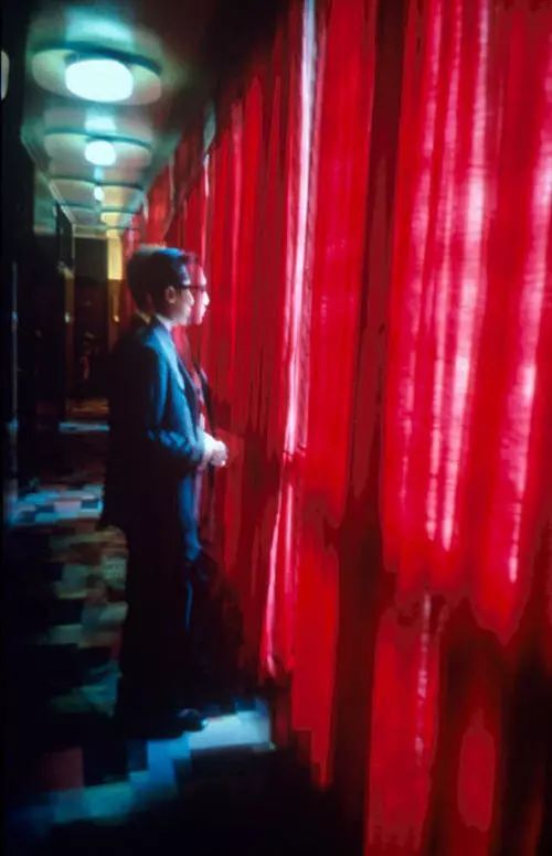 比如,梁朝偉走進他租的旅館房間那組鏡頭。一上來就是旅館的走廊,從這頭到那頭,全都輕輕的飄蕩著深紅色的窗簾,絢麗的地板向遠處延伸著。接著,就是梁朝偉腳的特寫,進門。我想我們更常見的畫面是,鏡頭跟著一個人走在走廊上,然后,在門口停下,他進門。這是比較常規的處理方法。但是,王家衛的選擇是——他給你一個深邃的空間,然后,讓你的視野就停留在那個空間的盡頭。他是如此的小心翼翼,似乎怕你不知道那只是一個別人的故事,似乎怕你走進去就會打擾了陳年舊事中的人物。
