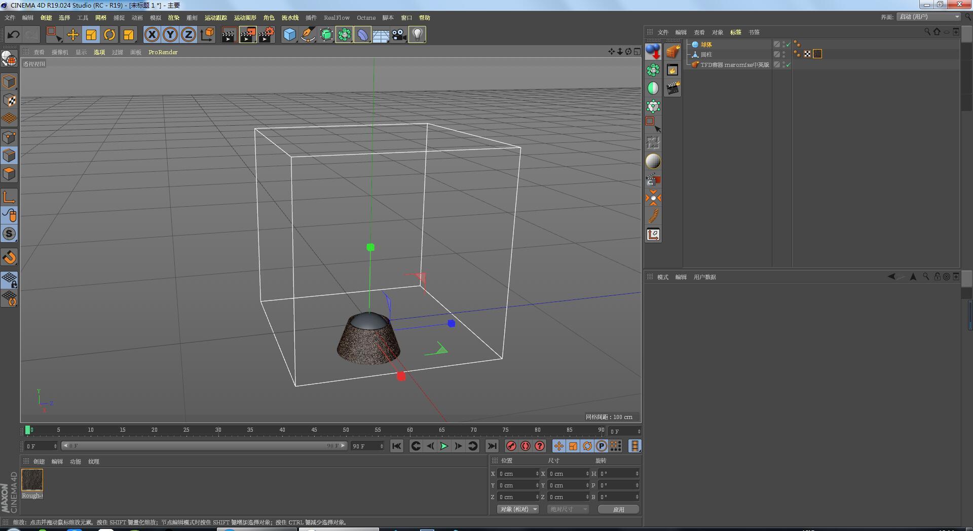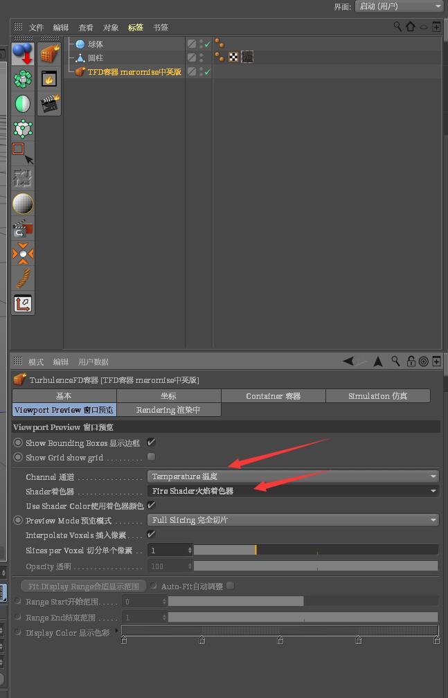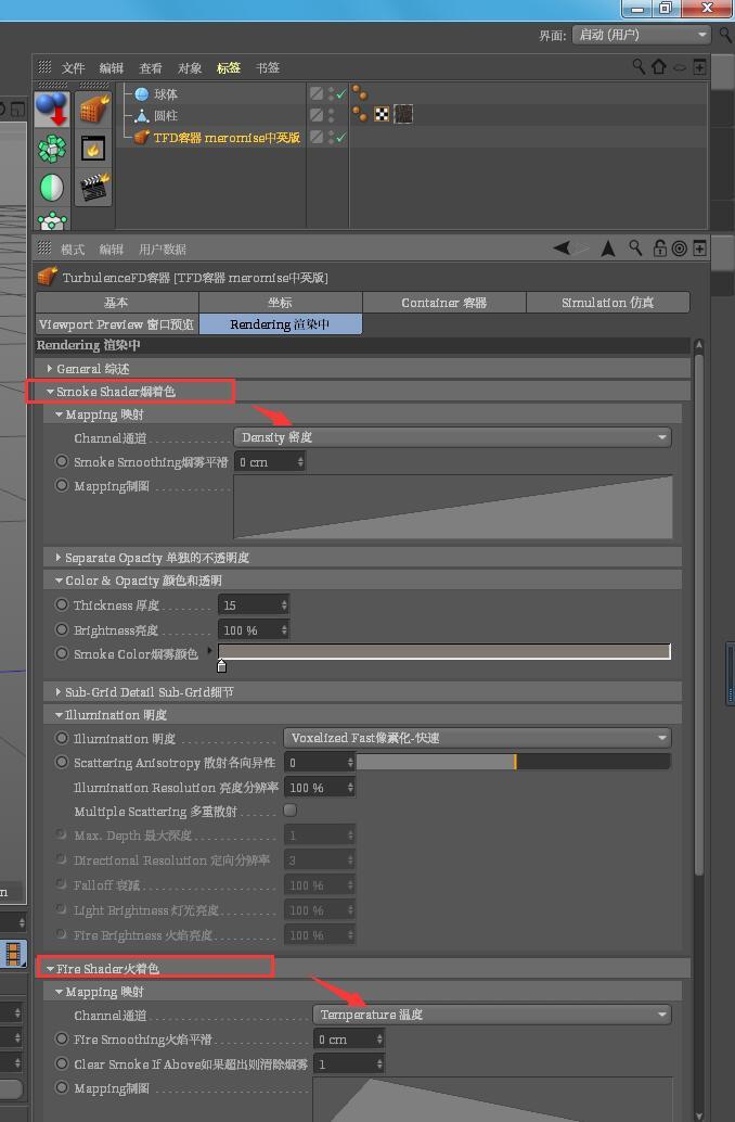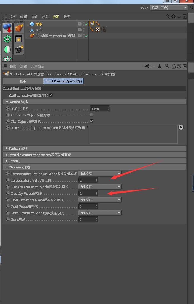 6、選中球體添加TFD發射器標簽,設置通道中的溫度值和密度值均為數值1(溫度---火;密度---煙);