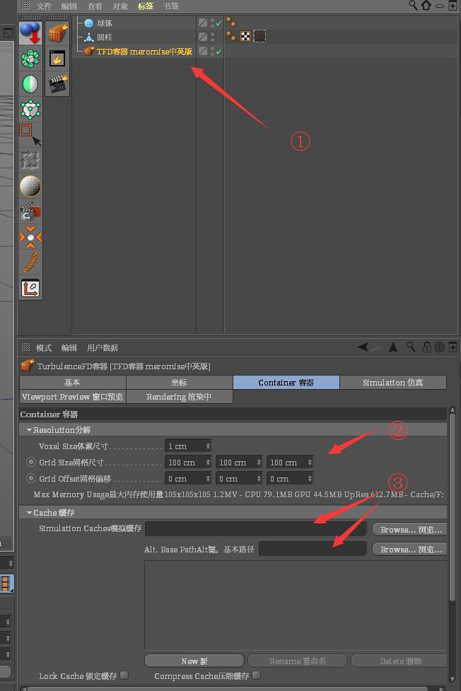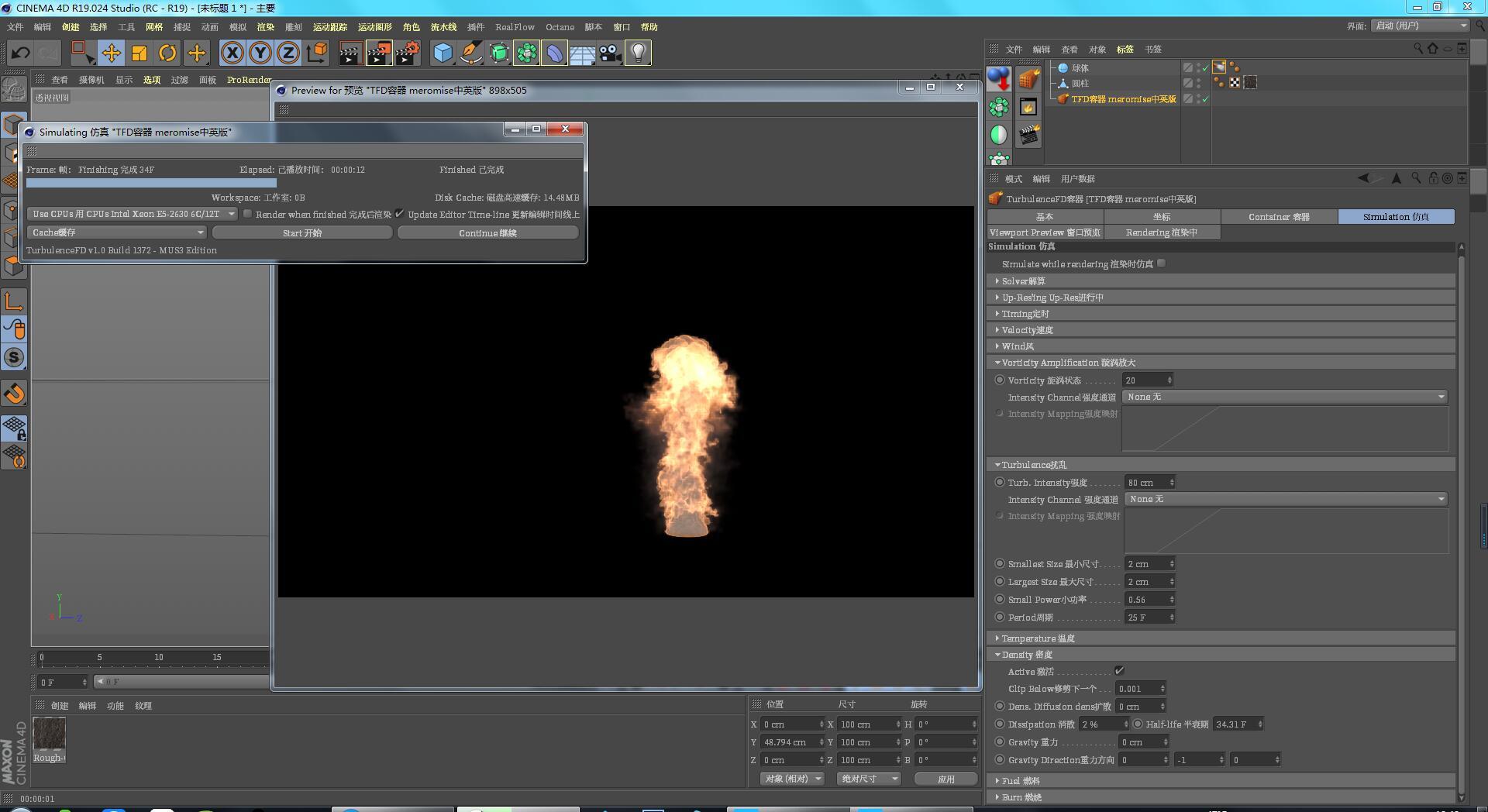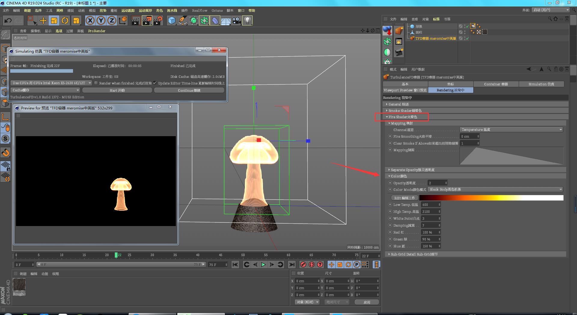 4、選中TFD容器----調整合適的容器尺寸----設置緩存路徑(一定要英文);在窗口預覽中選中溫度---火焰著色器;在Rendering渲染中調節----煙著色---密度 和 火著色---溫度(其余數值不變);