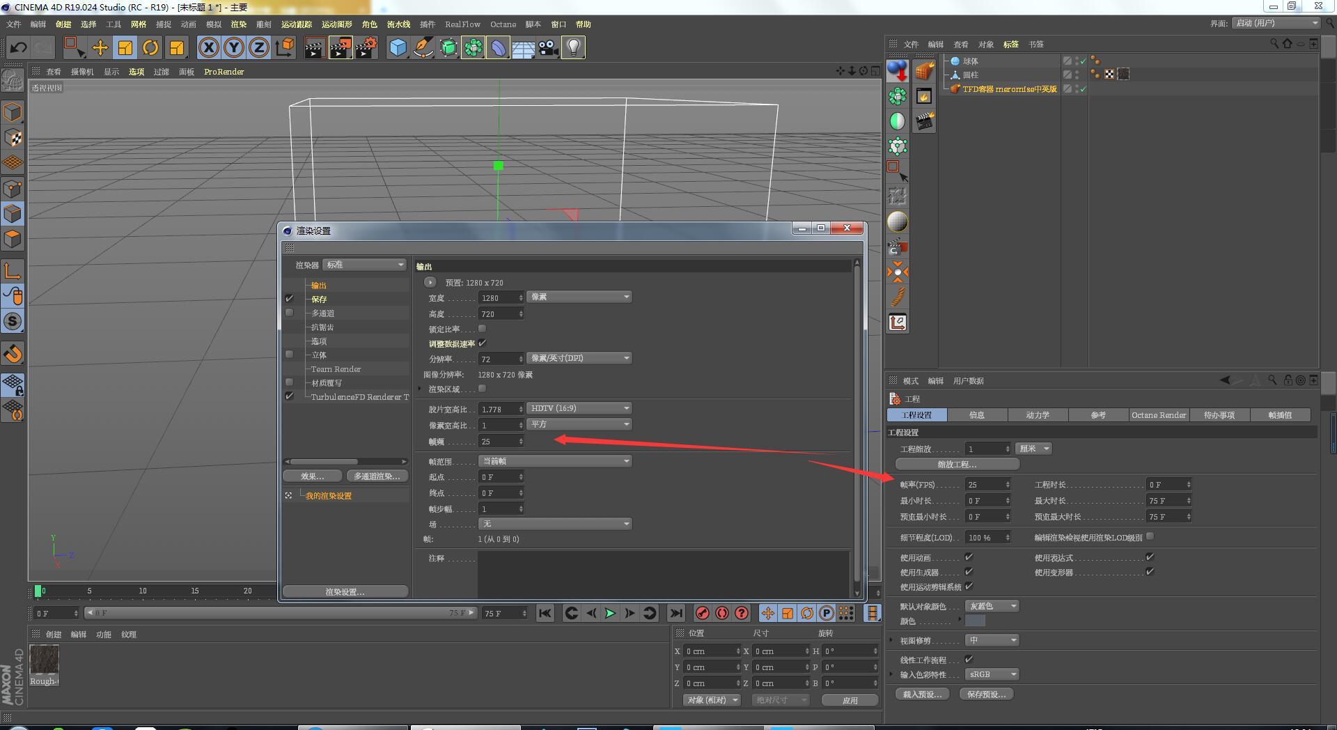 5、CTRL+D打開工程菜單,把幀率改為25,且,渲染設置中的輸出幀頻也改為25,兩者必須一致;