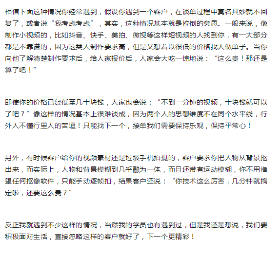所以,對這類制作水準不高的單子,你不用期望太高,不僅賺不了幾毛錢,甚至是浪費精力。當然也不排除有些客戶思想覺悟比較高,能跟你同頻,始終跟你心有靈犀的情況。