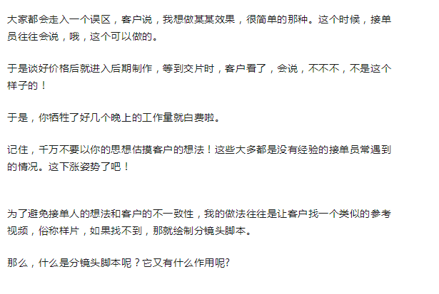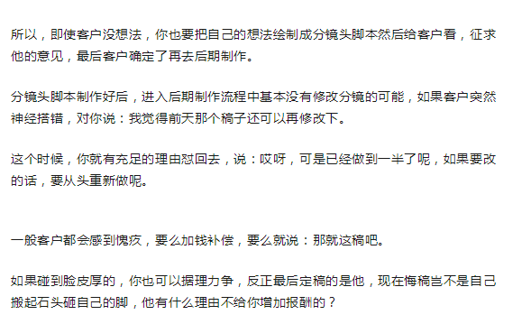 很多人抱怨,后期工作如何累,客戶如何難搞,實際上,造成這樣的原因,很大程度上沒有捋清做單流程。就是我上述原因等等,擅用分鏡腳本,可以讓客戶對設計不滿意的部分在前期解決,很大程度上解決后期修改的次數。