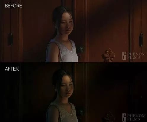 比如《記憶大師》第一場戲是回憶的戲份,講一個小女孩家里發生了兇殺案的情節。前期拍攝的素材畫面環境相對亮一些,但調色后,基本上整個環境都壓得比較暗了。人物的衣服也整體壓暗處理,但是最亮的部分是留在了人物的臉上,表現其眼神,這場戲份調色的重點放在了環境氣氛的突出上。