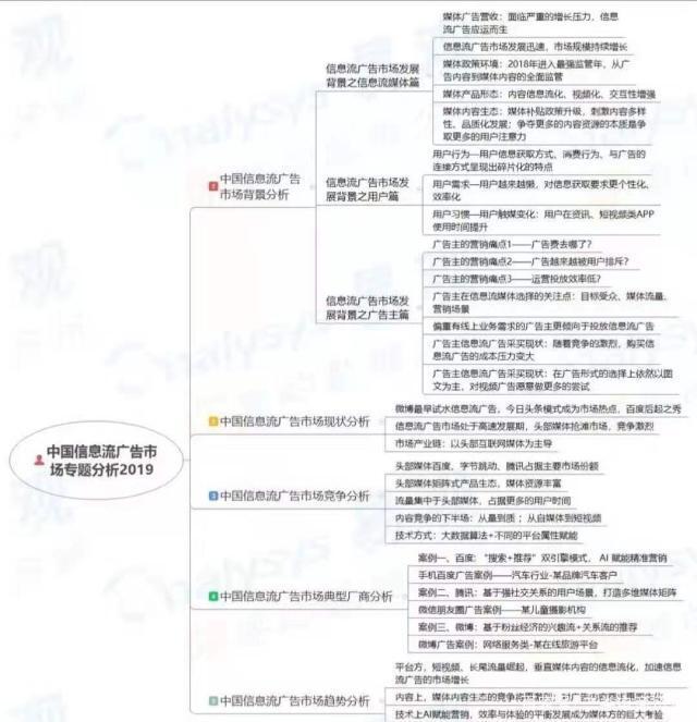 下圖是《中國信息流廣告環(huán)境趨向?qū)n}說明2019》的完備版頭腦導(dǎo)圖。