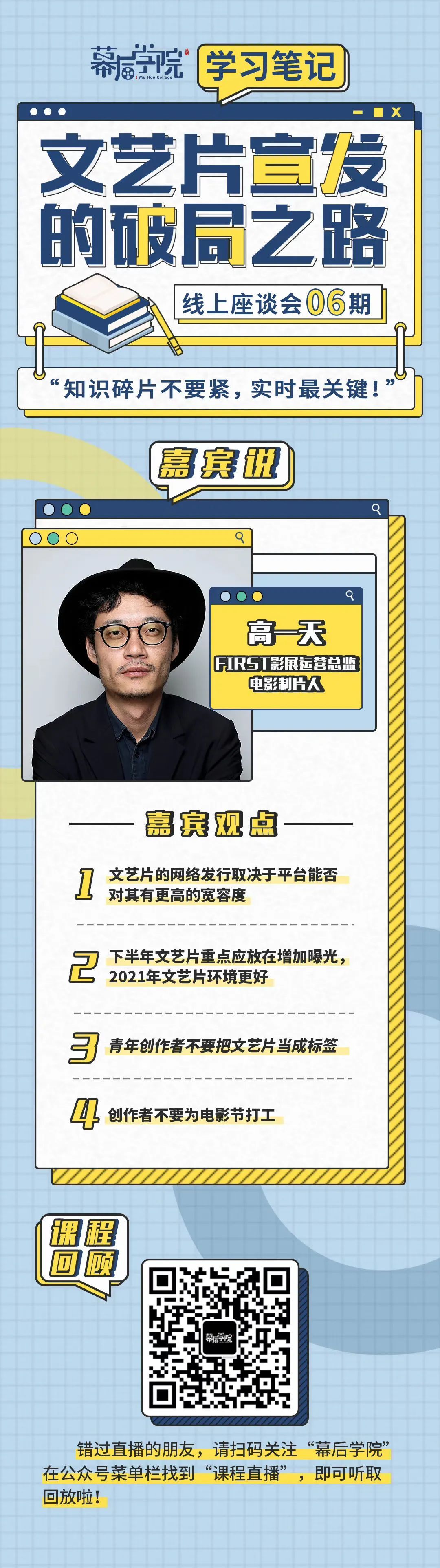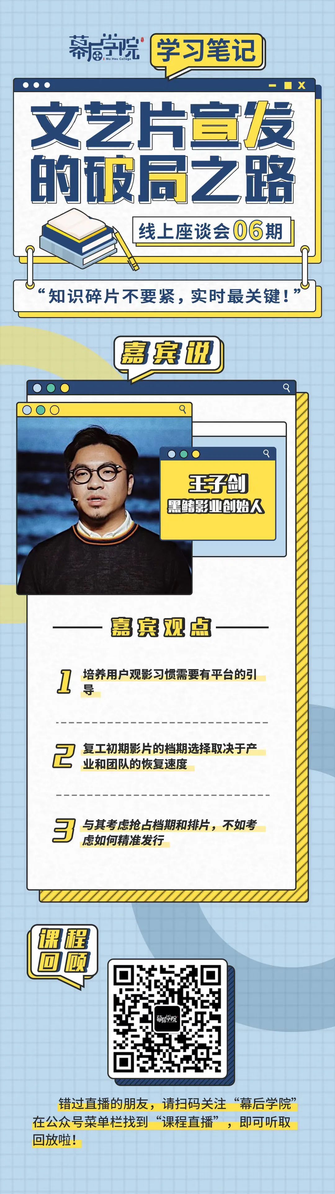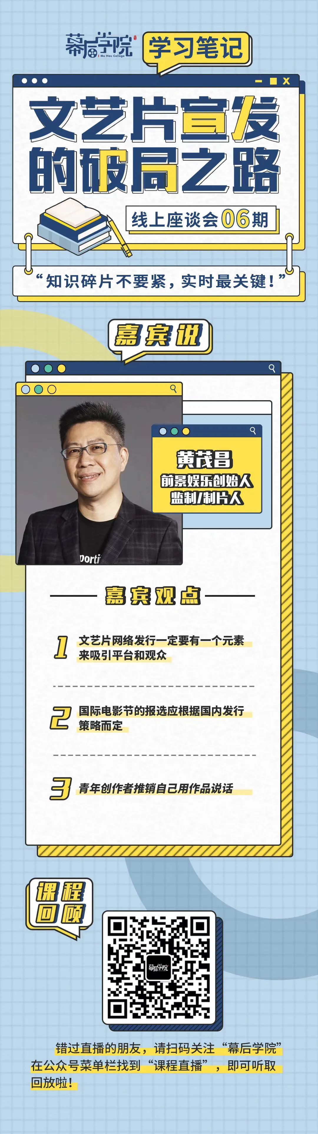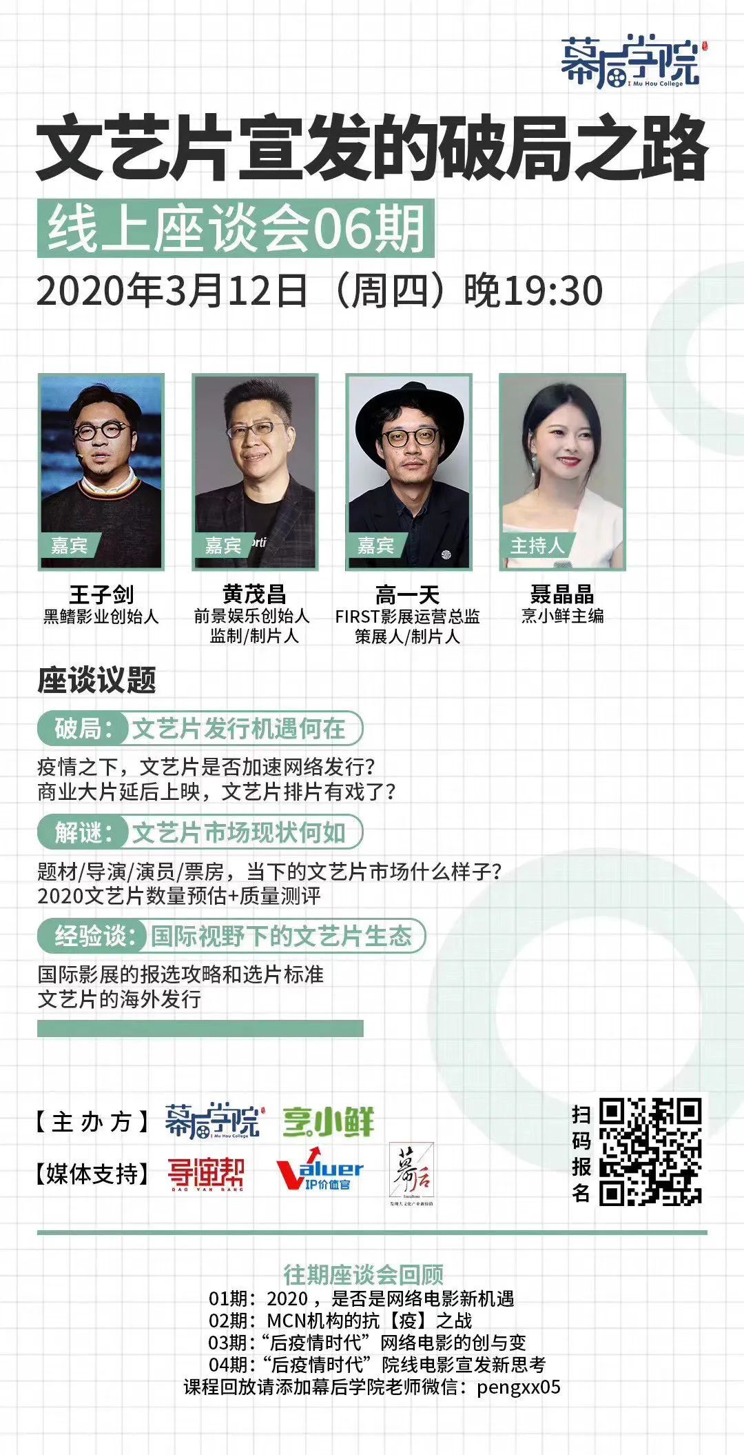 為此,我們聯合幕后學院,于3月12日推出主題為“文藝片宣發的破局之路”的線上座談會,對話嘉賓黑鰭影業創始人王子劍,前景娛樂創始人黃茂昌,和FIRST影展運營總監高一天。