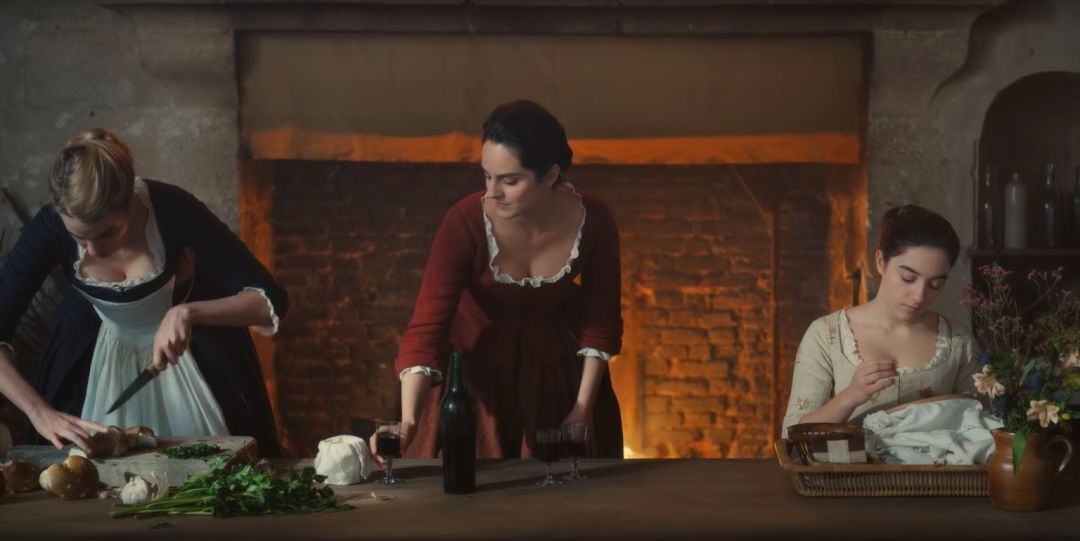 克萊爾·馬松在拍攝現場席安瑪可以犧牲拍攝時間的原因在于,她將鏡頭設計得更長,而精心設計過的鏡頭只需要少量的布置。同時她需要克萊爾·馬松在攝影中對光線進行極大的控制。“我們需要光線,”希亞瑪說,“我們非常執著……光線似乎是從這個角色身上散發出來的。”在拍攝前,馬松和席安瑪去到畫廊,研究當時女性畫家所作的肖像畫。馬松從這些作品對皮膚及其紋理的呈現方式中獲得靈感,但不一定是通過光線。“我們好像完全沒有感受到光線(的存在)。”馬松說。“我嘗試創造一種包容一切的柔和感,來弱化光線的方向性,捕捉情緒的變化、最輕微的顫抖,來表現她們的臉紅,感受她們的情緒,而不是讓光線占據主導。”感覺好像光線是從她們的臉上散發出來的。不管她們站在哪里,我都盡量保持這種不真實的樣子。”馬松可以控制窗外的強光源,用旗子和柔光板的巧妙組合來塑造和柔化光線。無論這兩位女演員轉身或走到哪里,光都像是從她們身上散發出來的。馬松努力在畫面中保證光線對比,以強調取景空間的動態感,但是也要保證所有的對比(表示光線來自特定方向)不會照到女演員的臉上。