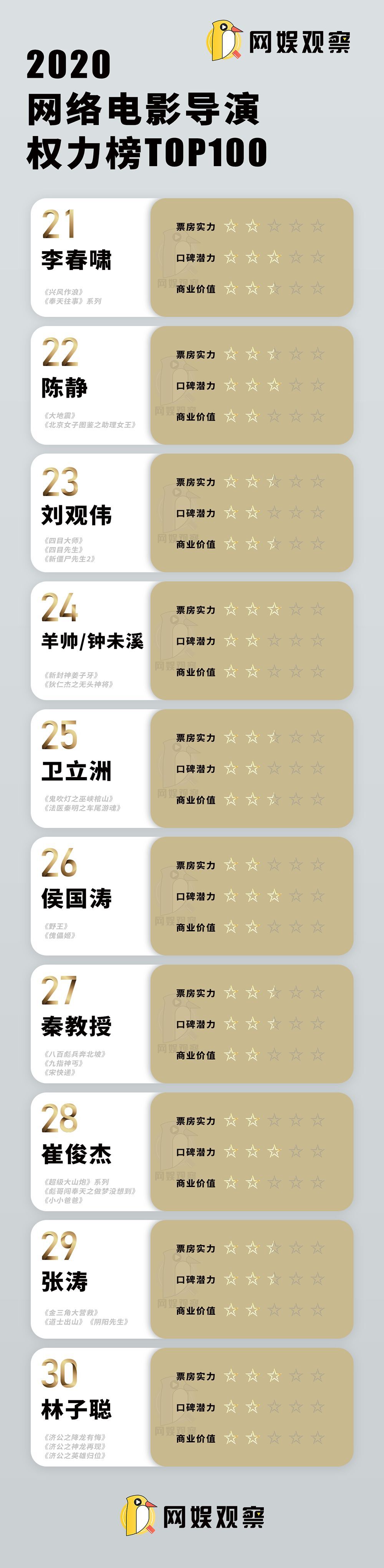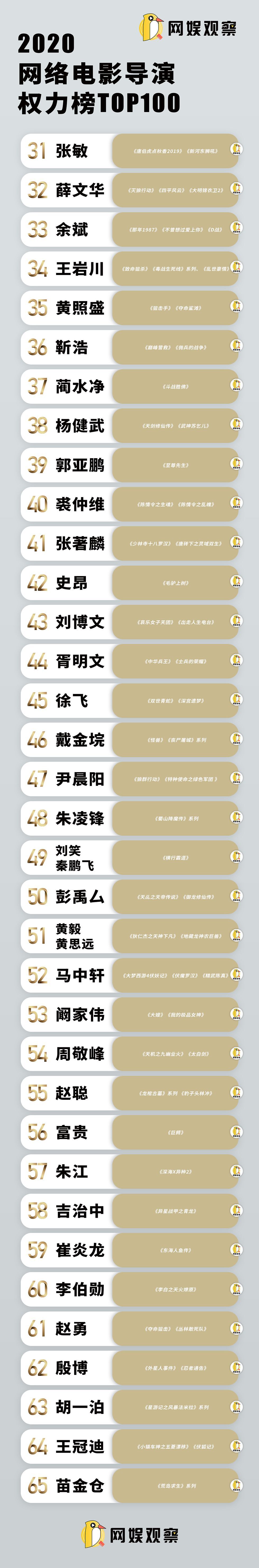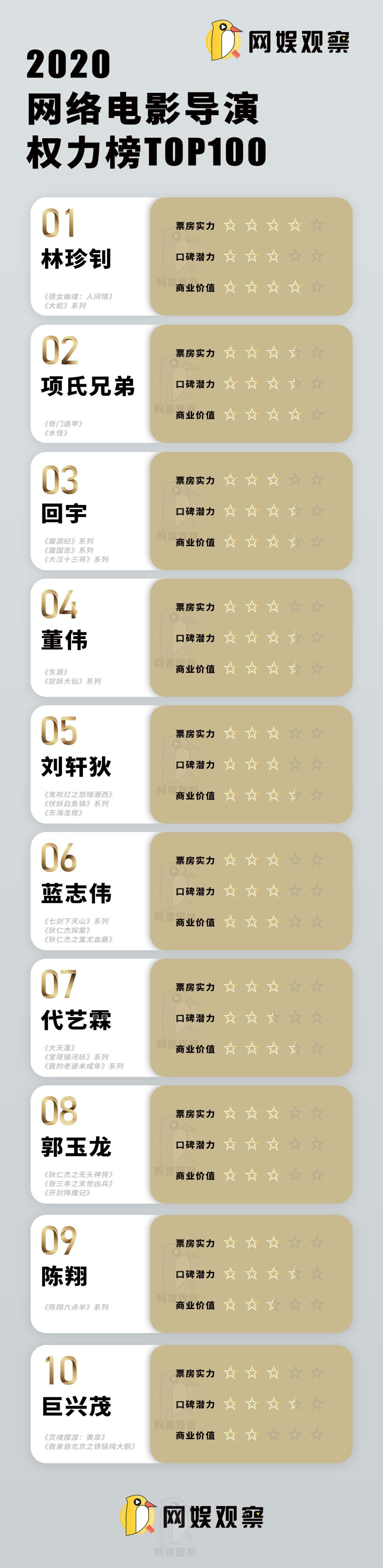 值此網(wǎng)絡(luò)電影“暖春”,我們依據(jù)大數(shù)據(jù)模型,結(jié)合市場行情,通過多方調(diào)研,制作出一份2020網(wǎng)絡(luò)電影導(dǎo)演TOP100權(quán)力榜,為各投資方、制作方、播出平臺提供價值參考。