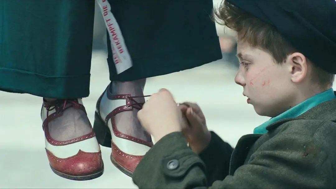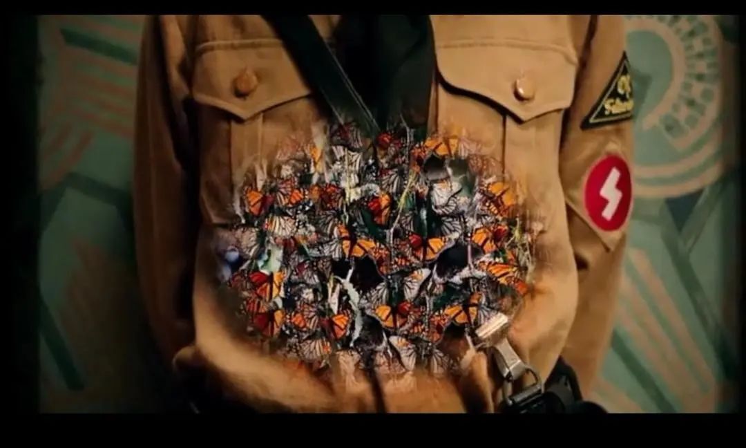在媽媽的教導下,喬喬被潛移默化的影響,最直接的表現就是她對艾莎的態度有了轉變。可令人難過的是,沒過多久,喬喬的媽媽就被吊死在街頭。從喬喬的視角看,他首先看到一個美麗的蝴蝶,可他一轉身看到的卻是兩只被高高懸吊的雙腳,喬喬為母親系好鞋帶,抱著那雙懸掛于空中的腿哭泣。也正是因為母親的死,他心中的希特勒英雄也隨即幻滅,當希特勒再次出現在他面前時,他一腳將希特勒踹出窗外。