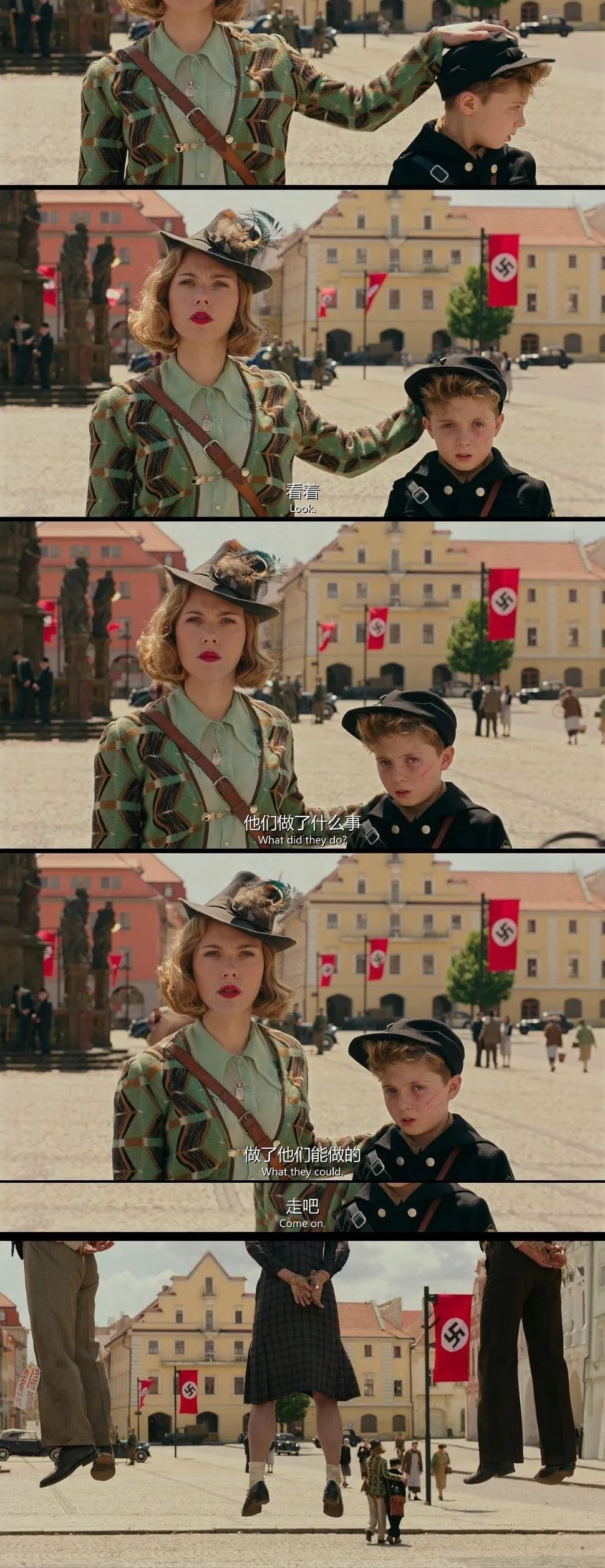 除了向往自由,她也會毫不避諱地讓喬喬直視戰爭給國家帶來的慘痛,影片中有一個橋段,羅茜帶著喬喬上街,看到幾個人被吊死在路邊,喬喬問媽媽:“他們做了什么事?”羅茜說:“做了他們能做的。”相比喬喬臆想中教他標準的喊著萬歲的希特勒,羅茜無疑從內在塑造了他的三觀。