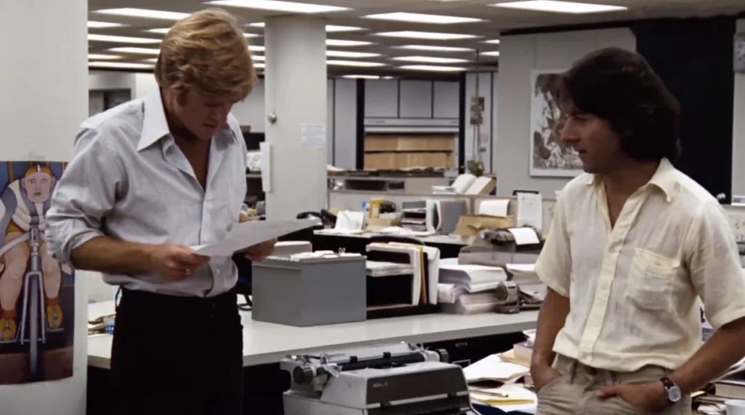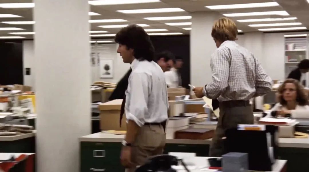 伯恩斯坦和伍德沃德跑著穿過《華盛頓郵報(bào)》寬闊的新聞編輯部,直奔他們的辦公室。攝影機(jī)也跟著兩位記者一起運(yùn)動(dòng),目的是為了配合二人激動(dòng)的心情。從這以后,兩位記者獲得了沉著和自信,鏡頭也隨之而更加流暢。