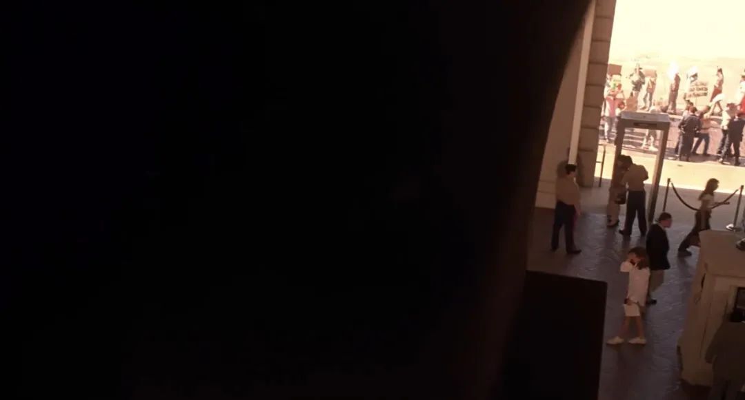 接下來,攝影機(jī)從她身上搖開,搖到一個(gè)黑色的柱子處停住了。這時(shí),黑色的柱子在畫面中占據(jù)了支配性的位置。導(dǎo)演的意圖是凸顯黑色的意義,因?yàn)楹谏韧谔摕o、無存在感以及被人冷落。