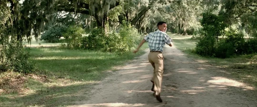 阿甘背對(duì)攝影機(jī)奔跑,我們可以看到他所要前往的地方。