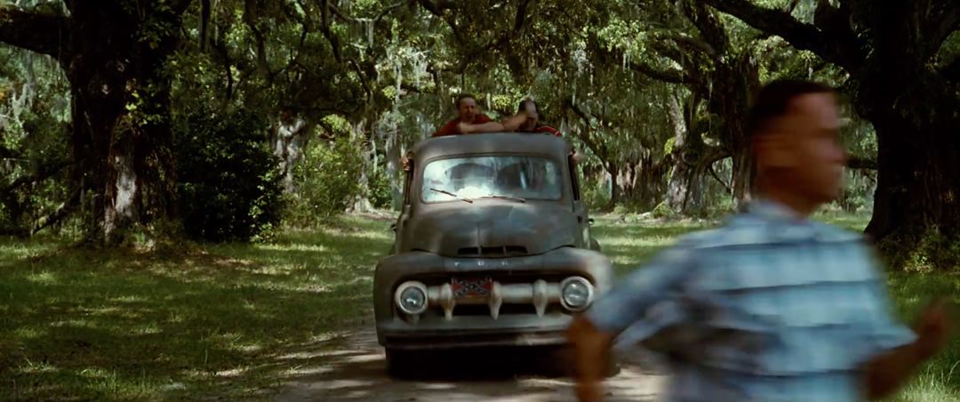攝影機(jī)面朝阿甘固定在卡車的底板上,阿甘奔跑時(shí),卡車和攝影機(jī)配合他的運(yùn)動(dòng)。在這種拍攝方式之下,景別從遠(yuǎn)景漸漸過渡到特寫。