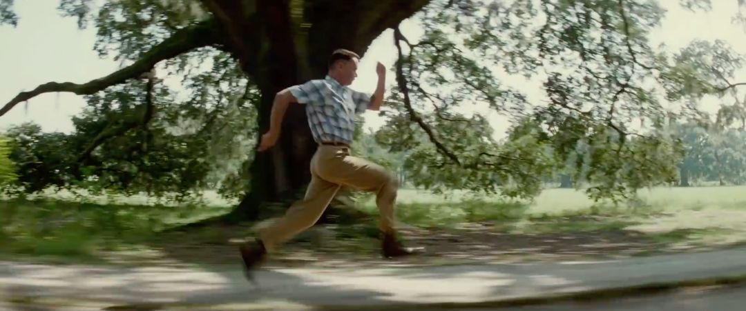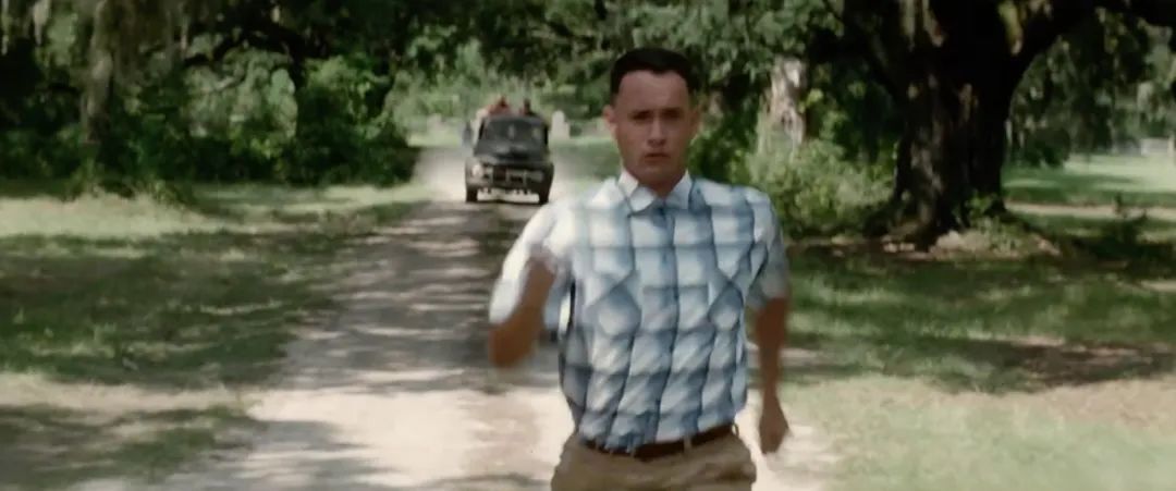 在這些拍攝方式中,搖鏡展現(xiàn)的東西最多。當(dāng)導(dǎo)演使用搖鏡時(shí),我們可以看到阿甘的從哪里跑來和正跑向哪里。正面跟拍時(shí),我們可以看清阿甘的面部表情。