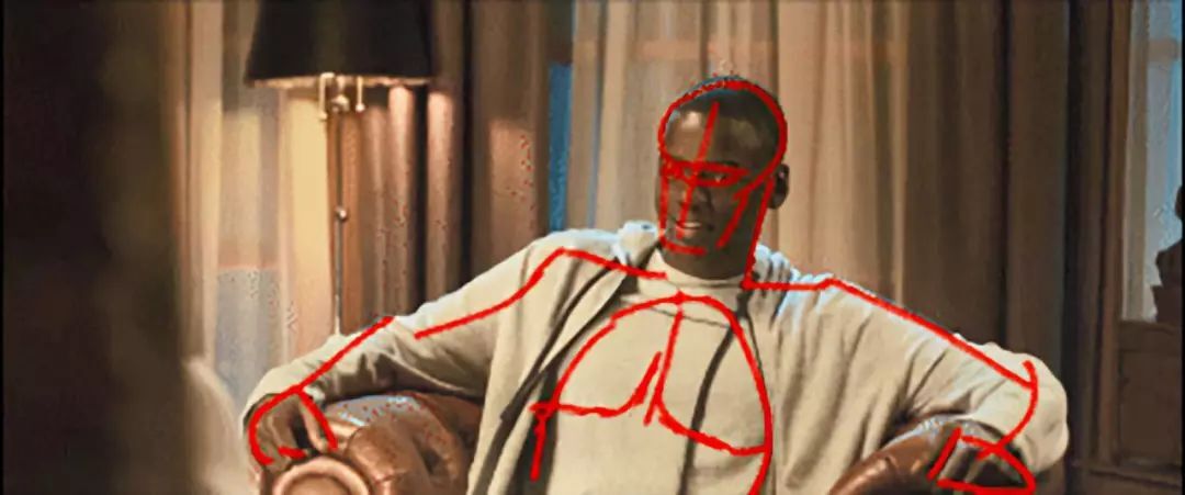 有了前面的分析,這里就很容易理解,米西問克里斯在這里感覺怎么樣,克里斯臺詞雖然說 it’s perfect,很完美,但是其身體語言卻透露了真實的感覺——身體動態線顯示出他以一種很扭曲的方式坐著,雙手指緊緊抓住沙發扶手,暴露出內心的不安。