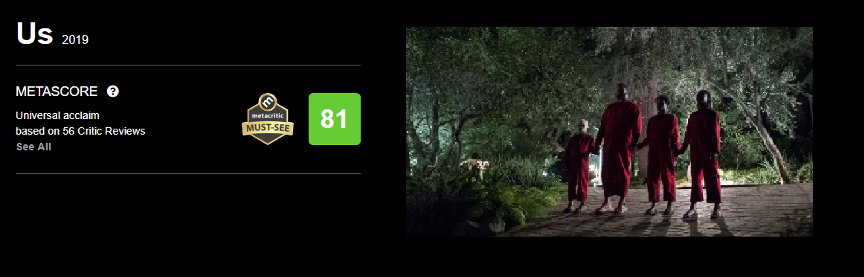 如果說《遺傳厄運》是中小型制片公司的一招險棋,那么2019年上映的恐怖片《我們》則是屬于傳統(tǒng)制片廠的一次大獲全勝。曾憑《逃出絕命鎮(zhèn)》博得評論界一致贊賞并最終獲奧斯卡提名的導演喬丹·皮爾,在去年帶著新片《我們》重回大銀幕。影片由環(huán)球制片廠出品,故事聚焦一家四口,本處于正常生活軌跡中的四人卻在某一天遇到了長相外貌與他們完全一致的另外四人,由此上演一場“虐殺”與“反虐殺”的恐怖戲碼。《我們》成本僅有2000萬美元,作為一部大制片廠作品,這個數(shù)字并不算太高,但最終影片票房達到了驚人的2.55億美元,回報率高達12倍,同樣是近年恐怖電影中的佼佼者。