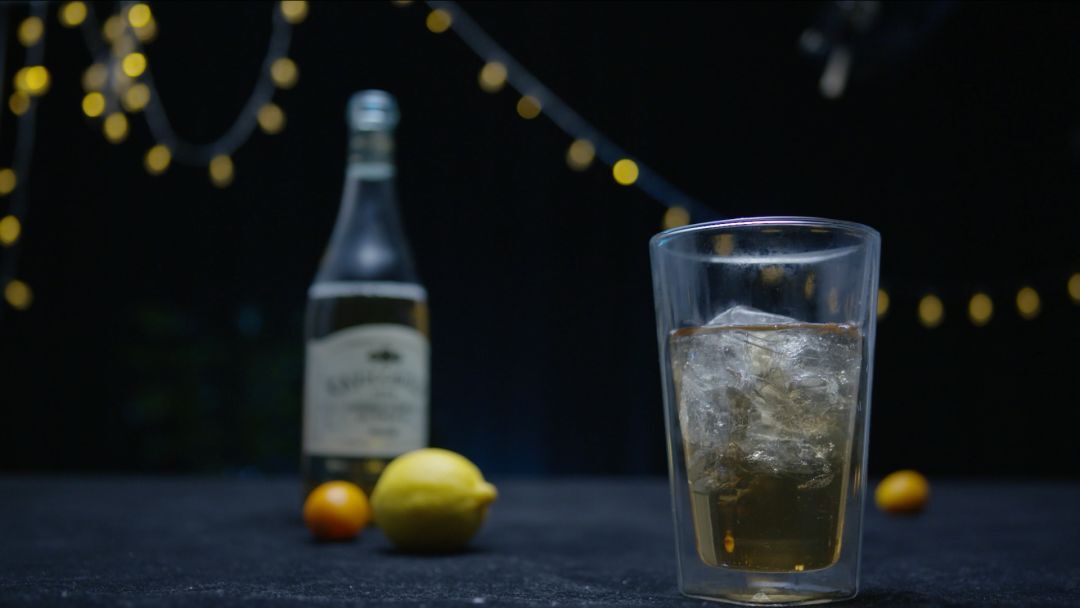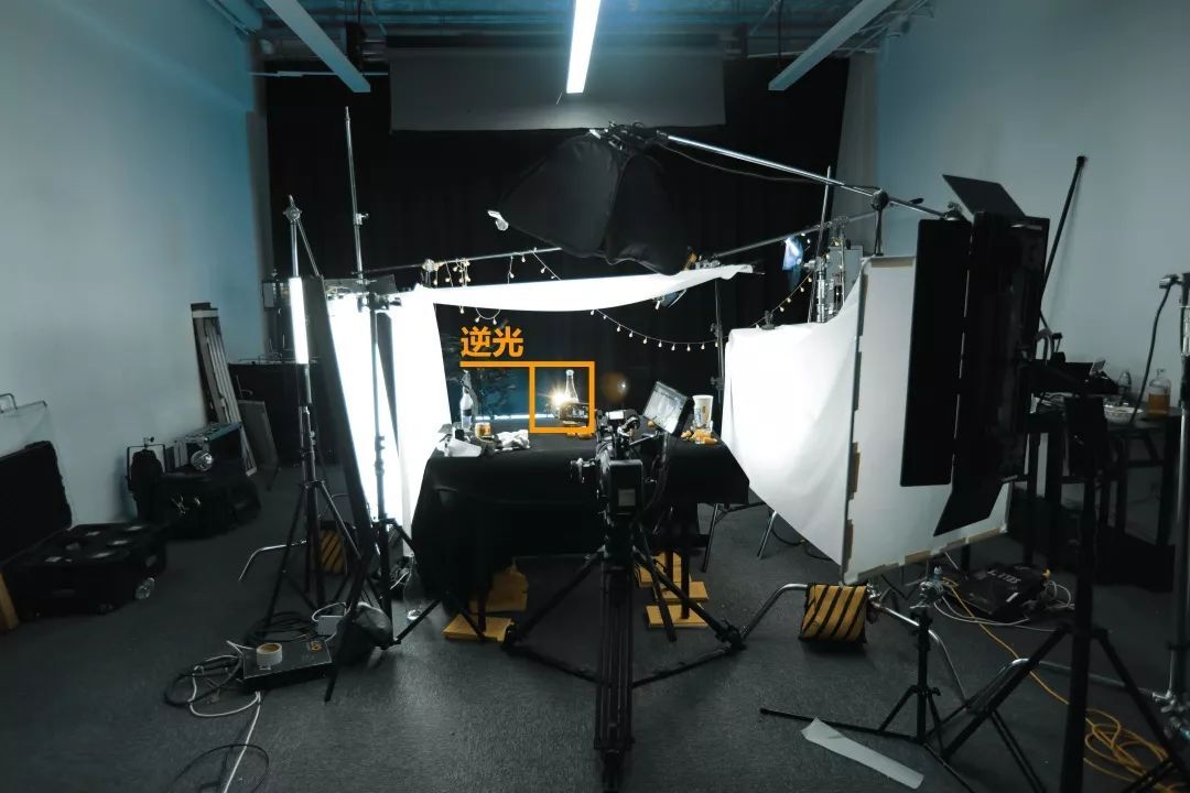 為了讓光源面積更大,光線更加柔和,我們又增加了一層柔光布,在杯子和冰塊的上沿,以及酒瓶的上沿形成散射的主光效果,給場景進行基本的光線造型。