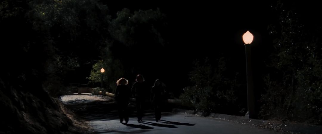 我更傾向于使用Maxi,NineLight或者是Dino(幾種鎢絲燈型),但最后還是選了菲涅爾燈。比如,當曼森家族走向Cielo Drive時,他們是在黑暗中行走,路邊只有幾個路燈,20K的背光照亮他們的輪廓。我想要畫面里只有他們的影子在向攝影機移動,給人物補光的就只有微弱的反射光線。