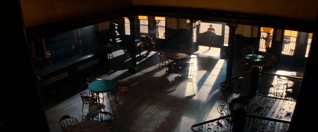伊恩:我們是在環球公司的西部街道片場拍攝。面對窗戶的鏡頭,我們會用網格布蓋住街道,這樣外面就不會過曝。我們有三個18KW 5600K的Alpha燈,透過窗戶和門做出匹配的陽光效果。