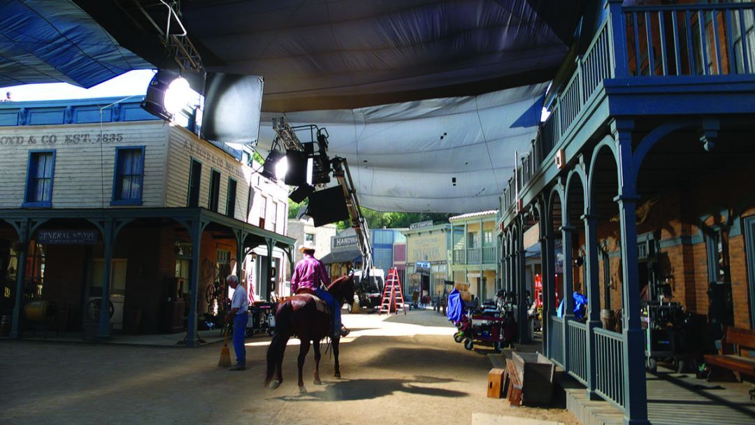 網格布懸掛在環球公司的西部街道布景上,以消除背景動作和建筑物上的正面光。18KW的Alpha燈懸掛在支撐屋頂的桁架上,安裝在Condor升降機上,給酒吧內景提供照明。