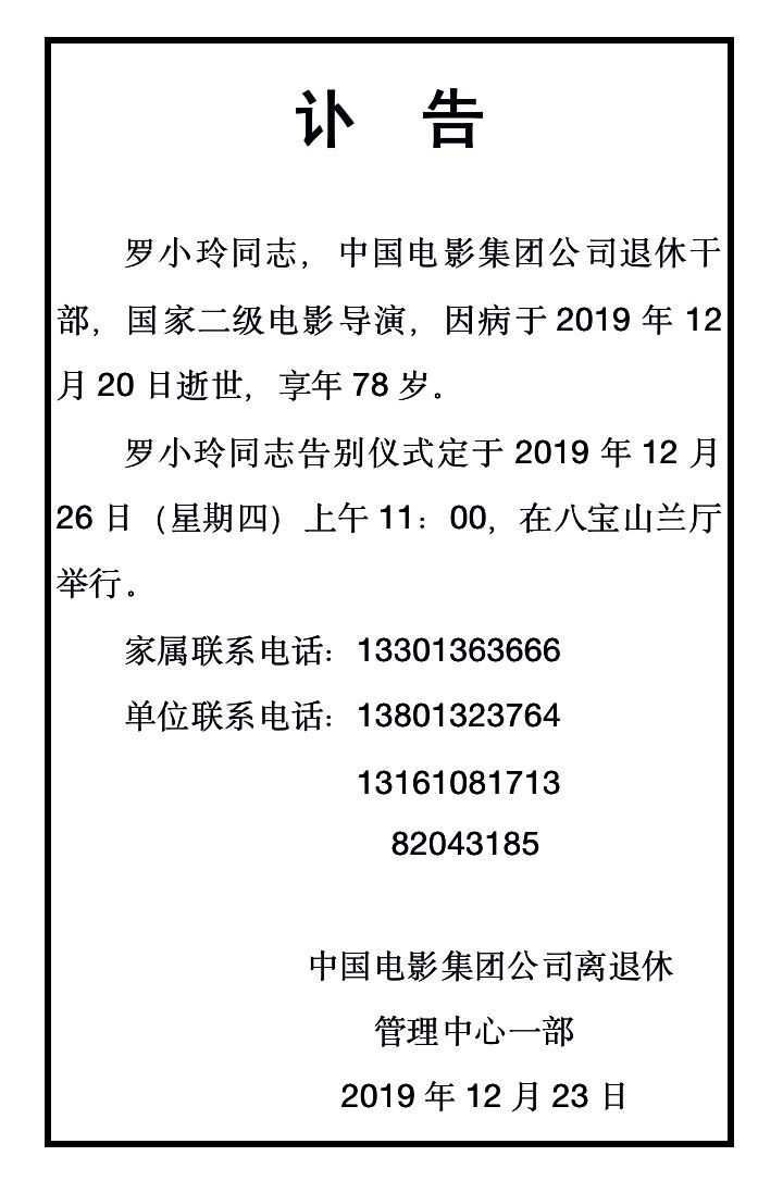 2019年,我們接連收到令人悲痛的消息。我們又失去了一位,對中國兒童電影事業做出了不可磨滅的貢獻的導演。中國兒童電影制片廠二級導演、中國電影導演協會會員、中國電影家協會會員,中國電視藝術家協會會員、中國電影集團公司退休干部羅小玲同志于2019年12月20日因病逝世,享年78歲。
