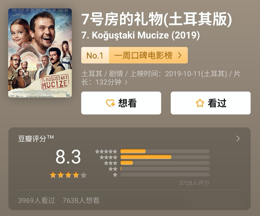 對于韓國版《7號房的禮物》,大多數觀眾都不會陌生,尤其是片中對于親情、正義、人性善惡等議題的描寫,更觸動了不少觀眾的淚點。對于這樣一部有著較多本土元素的現實向電影而言,相信絕大部分電影制作者都不會將其納入“翻拍”的考量行列中。但是在去年,一部土耳其版《7號房的禮物》橫空出世,不僅創下了土耳其本土電影的年度票房紀錄,更一度在imdb上獲得了8.3分的高評價。