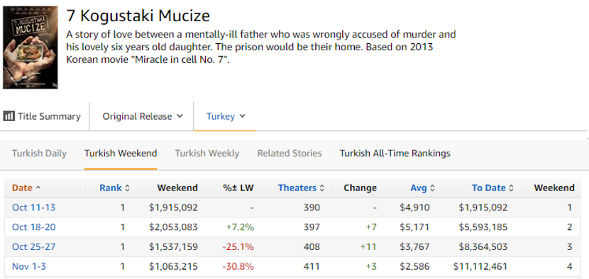 和韓國版上映后所引起的觀影浪潮類似,在去年10月于本土正式上映后,這部土耳其版《7號房的禮物》迅速登上了票房榜前列,首周即收獲了近200萬美元的票房,位列當周票房榜冠軍的位置。而在其后的一個月時間里,影片更多次蟬聯了本土票房榜冠軍,且連續10周均位列土耳其本土票房榜前十的位置,從影片所取得的口碑和商業成績來看,土耳其版的《7號房的禮物》可以說絲毫不亞于原版。