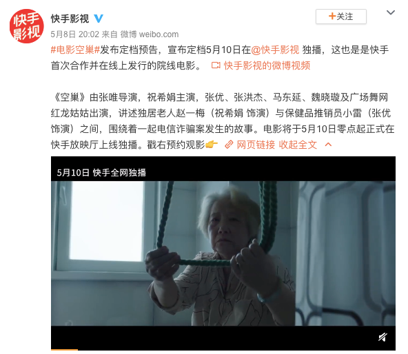 一面伴隨線下影院陸續開門復業的消息,另一面流媒體平臺依然在影視領域躍躍欲試。繼字節跳動旗下的抖音、西瓜視頻、今日頭條接連上線《囧媽》、《大贏家》等院線電影之后,快手也開始入局,在微博上新注冊的“快手影視”在8日發布第一條微博,宣布上線平臺首次合作并在線上發行的院線電影《空巢》,并選擇在母親節這一天零點起在快手放映廳獨播。