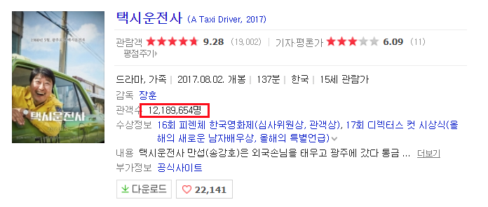 同樣,另一部改編自“光州事件”中真實故事的韓國電影《出租車司機》,已經成為了無人不知無人不曉的現象級電影,目前該片在韓國已突破1219萬的觀影人次。