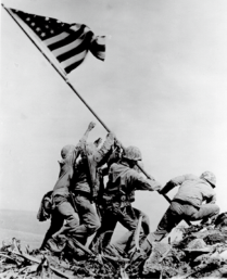 旗幟巨大且沉重——暗示著戰爭沉重。然而國家是強大有力的。無須擔心:士兵們正在將旗幟樹立起來,美國人將贏得戰爭。