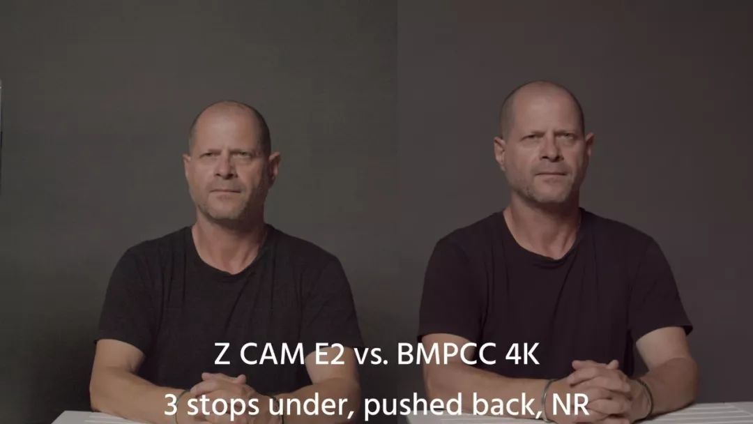 在欠曝4檔處,BMPCC 4K也達(dá)到了極限,出現(xiàn)了后期無法處理的水平條紋(這與我們BMPCC 4K與BMPCC 6K的對(duì)比測(cè)試結(jié)果是相同的)。在欠曝4檔時(shí), BMPCC 4K拍攝的畫面有變?yōu)榉奂t色的傾向,而Z Cam E2拍攝的畫面保留了原始的色彩,但出現(xiàn)大量粉紅色噪點(diǎn),兩者其實(shí)都不太理想。你也可以看看我們上一篇測(cè)試文章,再對(duì)比一下結(jié)果。最后一個(gè)問題,如果我們?cè)诤笃谲浖校瑢?duì)兩個(gè)攝影機(jī)RAW文件的噪點(diǎn)進(jìn)行降噪處理,是否有助于挽救欠曝3擋或4擋的畫面?所以我在達(dá)芬奇中對(duì)兩個(gè)RAW文件,分別應(yīng)用了3幀的時(shí)域降噪,閾值:30,以及10的空域降噪。Z CAM E2 vs. BMPCC 4K;在欠曝3擋時(shí),后期拉回還原到正常曝光,并使用降噪(達(dá)芬奇中的時(shí)域和空域降噪), Z CAM 畫面無法恢復(fù),因?yàn)闂l紋無法處理干凈(比如Johnnie的襯衫處)。