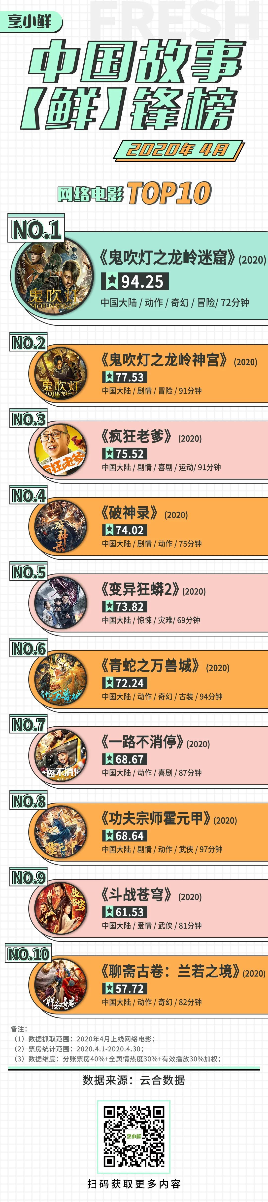 從烹小鮮4月網(wǎng)絡(luò)電影中國(guó)故事【鮮】鋒榜排名清晰可見(jiàn),兩部過(guò)千萬(wàn)級(jí)的影片均不是單純靠?jī)?nèi)容取勝,4月2日登陸愛(ài)奇藝平臺(tái)的《鬼吹燈之龍嶺迷窟》,緊隨潘粵明主演的網(wǎng)劇《龍嶺迷窟》之后上線,既依托于“鬼吹燈IP”自身的強(qiáng)大影響力加持,也多少沾了網(wǎng)劇高口碑的熱度,最終這部豆瓣評(píng)分僅為2.9的網(wǎng)絡(luò)電影收獲了2771.95萬(wàn)的分賬票房。