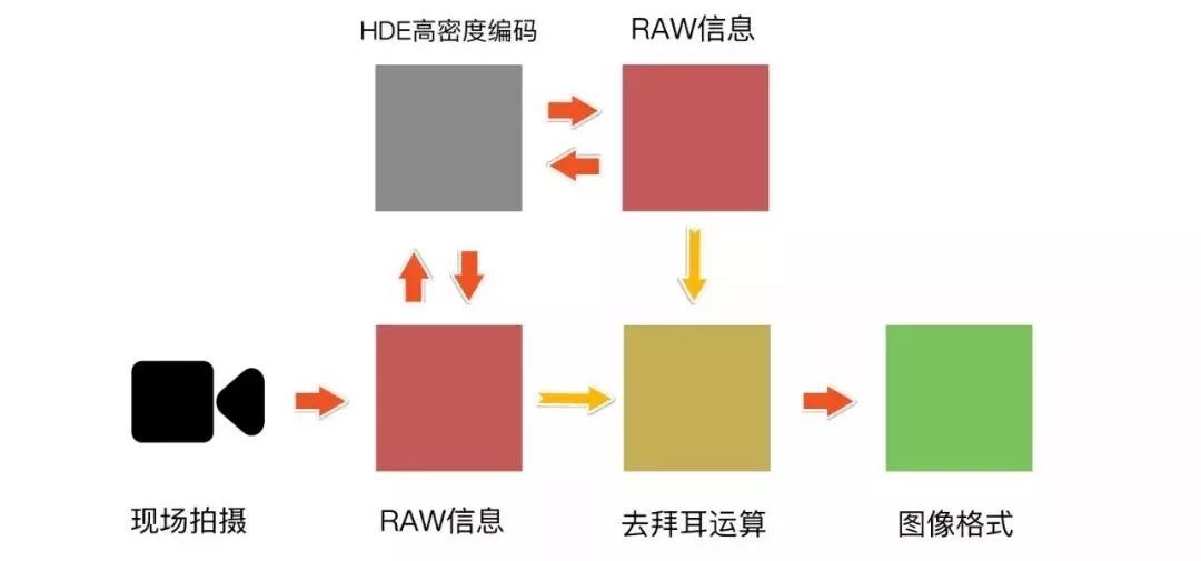 在這個過程中,畫面的色彩和亮度信息其實也不存在,我們之所以能看到圖像是因為那些圖像已經是處理之后的結果了,也就是上一個流程圖的黃色環節。這個過程既可以在攝影機內完成,也可以在外部設備上完成。