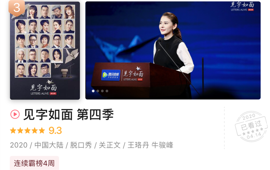 論口碑,第四季節目以9.3分的豆瓣高分收官,并連續7周霸榜豆瓣一周國內熱門綜藝排行榜,持續四季口碑不減,甚至穩中有增。論話題與熱度,官方話題#見字如面#8.8億閱讀、231萬討論,單期主題、信件內容及嘉賓解讀,都引發了網友熱議。