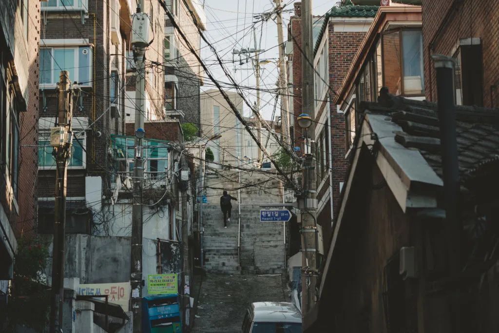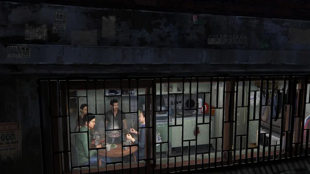 為了搞定這一點,美術指導李河俊參觀并拍攝了將要被拆除的空城,這就是他建造金氏家族擁擠的街道和擁擠凌亂的公寓原型。“我可以看到那里有人居住的痕跡,”對于這座鬼城,他這樣說道。“為了還原,我們甚至用硅材料對空房子中使用的舊磚塊進行了建模。”