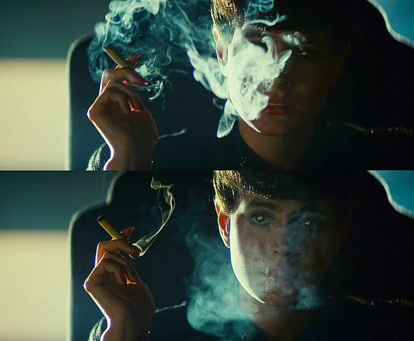 許多人也許會將杰夫·克羅嫩韋斯的黑暗風格與其早期為芬奇擔任操作員,或是跟隨達呂斯·康第拍攝《七宗罪》這樣的經歷聯系在一起。事實上,這似乎是一項家族事業——在他兩次贏得美國電影攝影師協會獎(ASC Awards)的父親喬丹·克羅嫩韋斯(Jordan Cronenweth)的職業生涯中,“少即是多”是一條重要信條。“使你獨樹一幟的,不是你決定打亮什么,而是你決定不打亮什么。(It’s not what you light, it’s what you don’t light that separates you from everyone else.)”在杰夫·克羅嫩韋斯的描述中,這是父親令他印象最為深刻的一句話。“年輕的攝影師總會犯這樣的錯誤——過度照明。其實你可以用最簡單的方式照明場景,仍然能得到很棒的結果。”在南加州大學的工作坊課程上,喬丹·克羅嫩韋思如是說。這場戲中,克羅嫩韋斯使用了一個巨大的背光,并在演員斜前方放置了一塊聚乙烯板,將光反射到演員的臉上《銀翼殺手》以低調、煙霧和霓虹著稱的視覺風格影響了后來整整一代的攝影師。而除了最為著名的《銀翼殺手》,為科波拉拍攝的《佩姬·休出嫁》(1986)同樣也是喬丹·克羅嫩韋斯為人所熟知的代表作,這部作品曾為他帶來美國攝影工會獎和奧斯卡金像獎兩項大獎。在工作坊課程上,克羅嫩韋斯帶領學生們一同回顧了他如何只用一盞燈得到片中地下室一場戲的杰出效果。這部電影是《回到未來》(Back to Future,1985)和《魔鏡之旅》(Through the Looking Glass,1976)的混合體。影片情節是:婚姻不幸的女主角佩姬·休,在畢業 25 年后參加高中同學聚會;在聚會上,她興奮得昏了過去,醒來后發現自己穿越到了 60 年代,重新回到 18 歲。命運給了她重頭來過的機會,重溫叛逆青春之后,她和丈夫也重溫了鴛夢。工作坊要重現的這個場景,是重返青春的佩姬·休偷跑到父母家的地下室里抽煙。對她種種異常舉動感到費解的男朋友,也跟著她來到地下室,想當面問個清楚。科波拉在拍攝佩姬·休娘家場景時大部分用的是實景,是在真正的房屋里拍攝的。這就給攝影師帶來了一個棘手的問題,場地太狹小,燈光設備施展不開。克羅嫩韋思用一個簡單的辦法解決了這個問題,并在此次工作坊中重演了整個過程。“單一光源照明往往是不得已而為之的選擇。我們當時拍攝的那個地下室只有一扇窗戶,如果我在室內布光,就得藏很多小燈,不方便且效果很假,所以我想干脆只用一盞燈好了。窗戶提供了解決的方案,至少值得一試。”克羅嫩韋思在窗外支起了一盞功率是 10K的鎢絲燈,用來模擬月光。他在陰影處放煙,利用煙霧對光線的反射來提供一部分輔光,一塊正對著窗戶的小反光板用于提供更多的反光。整個場景最有趣的部分是大部分輔光都是演員自己提供的:男演員身上穿著黃色的毛衣,當他走向窗戶邊的女主角時,毛衣上的反光為女主角的臉部提供了額外的補光。演員凱特·霍爾和比爾·布雷迪重現了《佩姬·休出嫁》中的場景整個布光計劃非常大膽。攝影機與窗戶略呈夾角,窗外的 10K 燈從左至右照進室內,勾勒出樓梯等道具與布景的輪廓。煙霧提供了最低程度的輔光。女演員背對著窗戶坐在床邊,臉部位于暗區邊緣,男演員與她相對而坐,燈光勾勒出他的側面輪廓,畫面很有張力。場景的亮區過曝,而其他的區域則幾乎是全黑的。