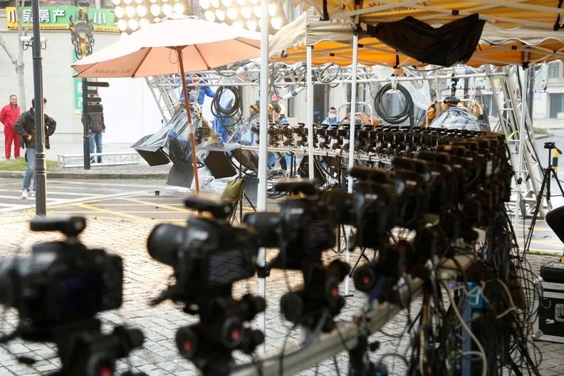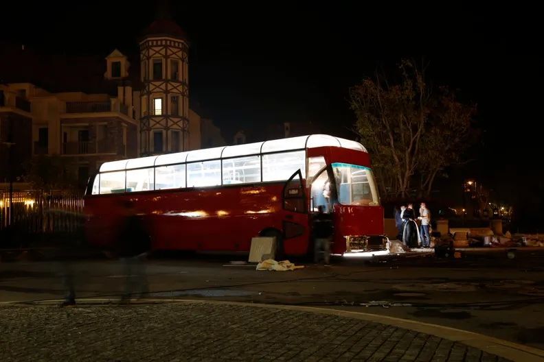 拍攝測試前兩天,氣象臺突然發(fā)布臺風(fēng)預(yù)警。為了安全性考量,制片組緊急安排搭建一個(gè)白色巨大雨棚及長達(dá)十幾米的LED屏幕,作為下雨時(shí)巴士戲份的拍攝備案。好在赤小馬誠心祈禱下,拍攝時(shí)一切順利,只是時(shí)不時(shí)下著小雨,絲毫沒有臺風(fēng)的跡象~晚上雖然雨下大了,我們在雨棚里還是順利完成了所有拍攝。