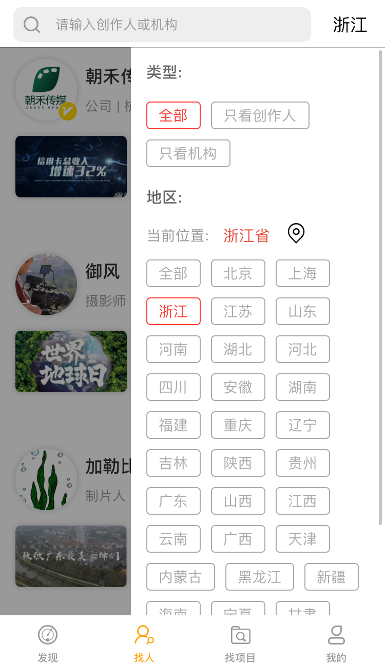以前在平臺上找個創(chuàng)作人,可能你得登上pc端才行,現(xiàn)在只要打開手機(jī)app,就能輕松找人。支持右上角選擇類型:創(chuàng)作人/機(jī)構(gòu),(偷偷告訴你,這個功能只有app有哦);還有地區(qū)分類可選擇。